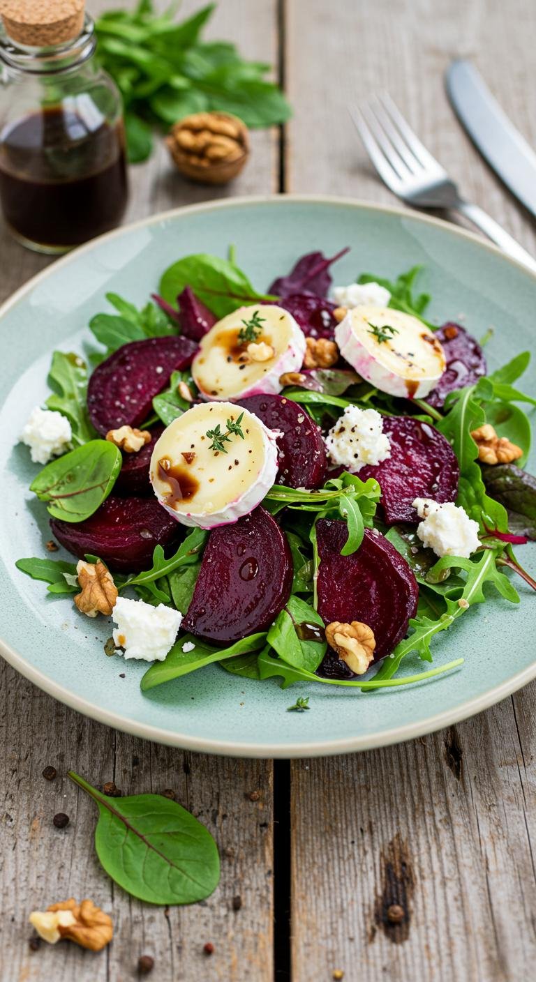 Indulge in the earthy sweetness of roasted beets paired with creamy goat cheese in this vibrant salad!