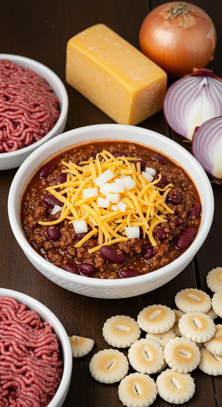 - Serve hot, topped with shredded cheddar cheese, diced onions, and a handful of oyster crackers for that perfect crunch!