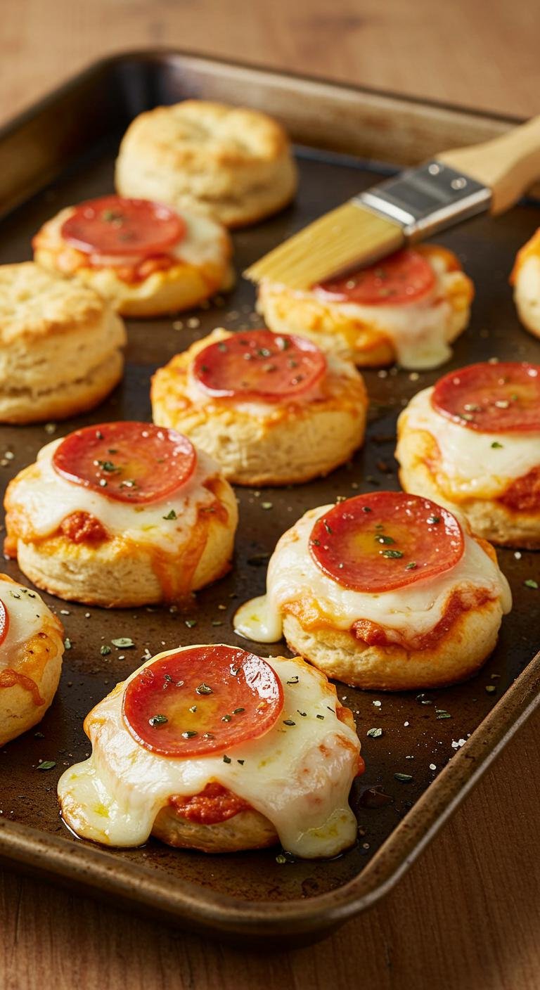 - Spoon a small amount of pizza sauce onto each biscuit.