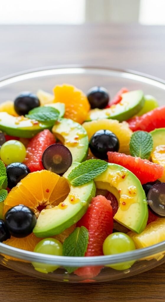- In a large mixing bowl, toss in the grapes, diced avocado, orange segments, and grapefruit segments.