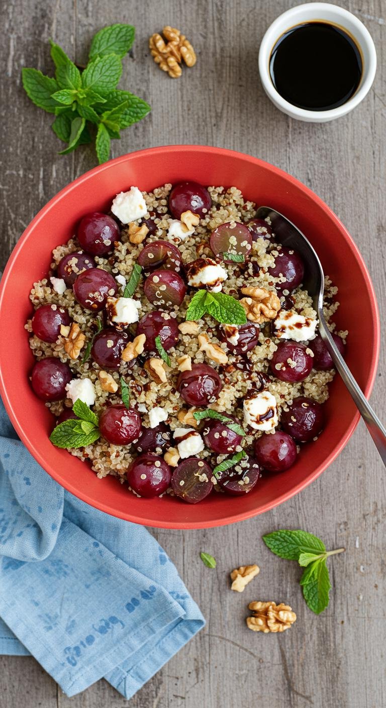 - In a large bowl, combine the roasted grapes, quinoa, feta cheese, walnuts, and fresh mint.