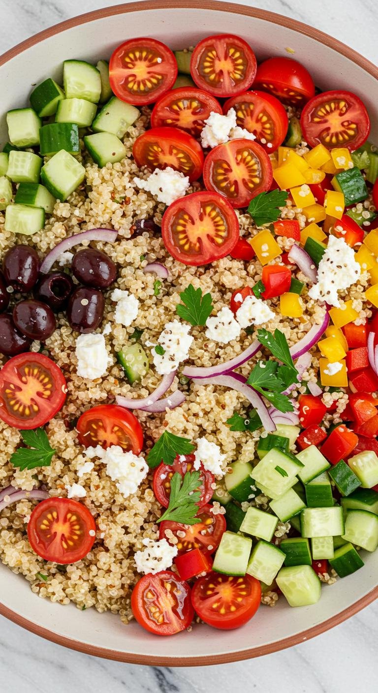 - In a large bowl, combine the cooled quinoa, cherry tomatoes, cucumber, bell pepper, red onion, Kalamata olives, and feta cheese.