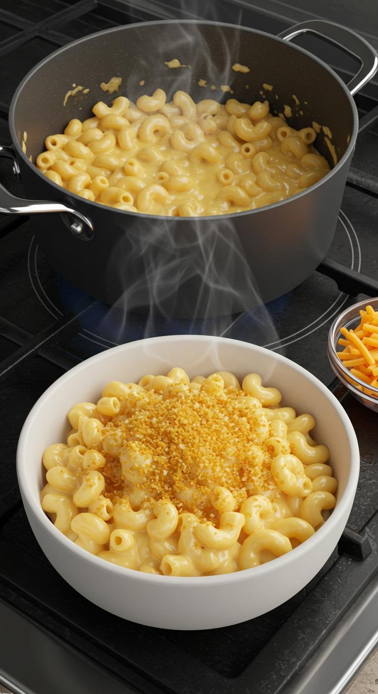 - If you like a crispy topping, transfer the mac and cheese to a baking dish, sprinkle with breadcrumbs, and bake at 350°F (175°C) for about 15 minutes.