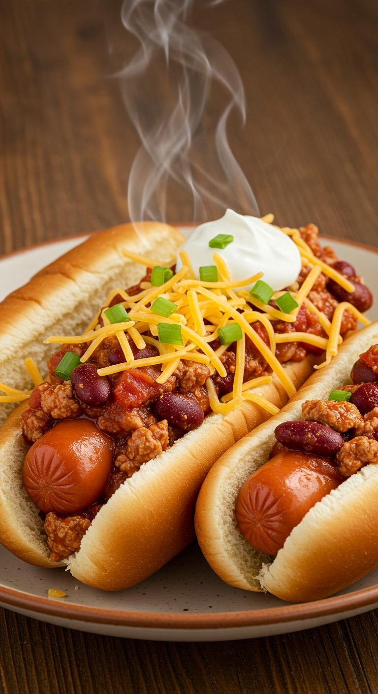 - Serve the hot dogs in buns, generously top with the chili, and add any optional toppings you love.