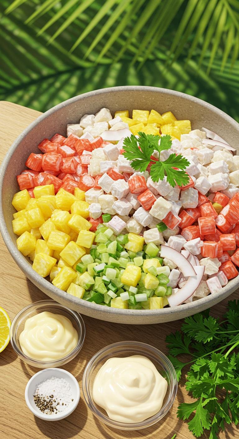 Indulge in a tropical twist with this invigorating Kani Salad featuring pineapple and coconut!