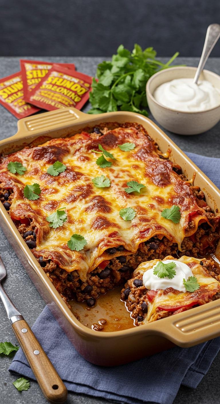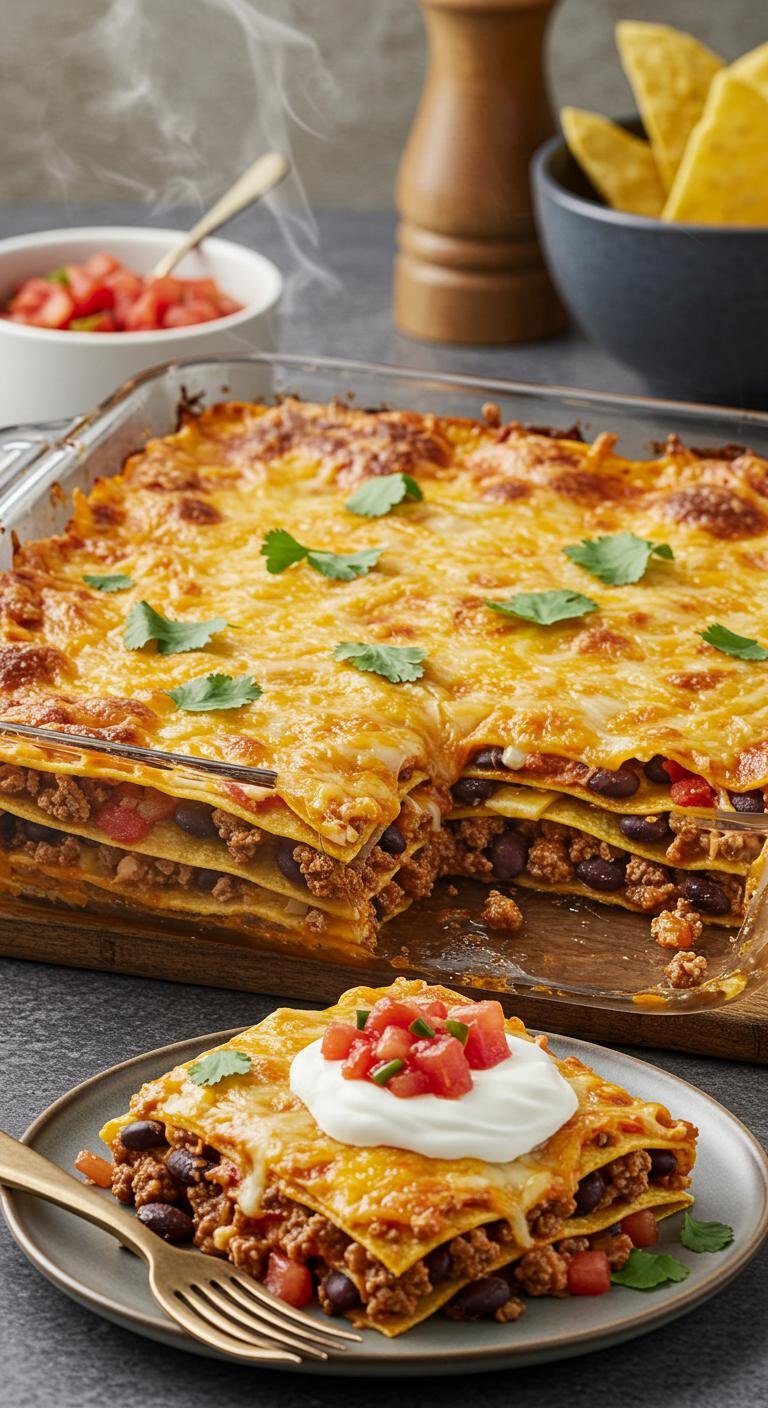 Dig into this mouthwatering Taco Lasagna and enjoy every cheesy, savory bite!