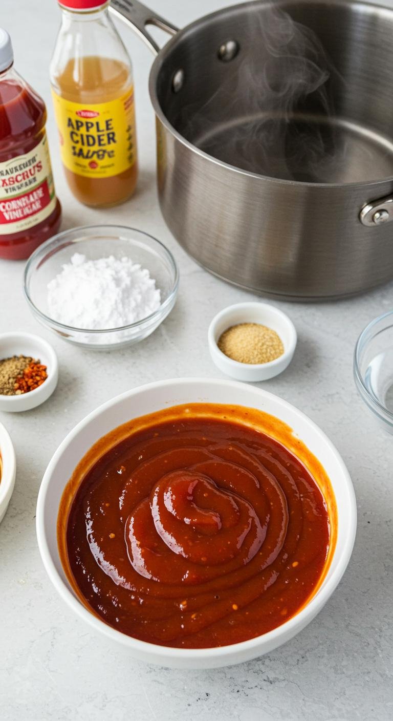 - In a medium saucepan, combine the ketchup, apple cider vinegar, brown sugar, and soy sauce.