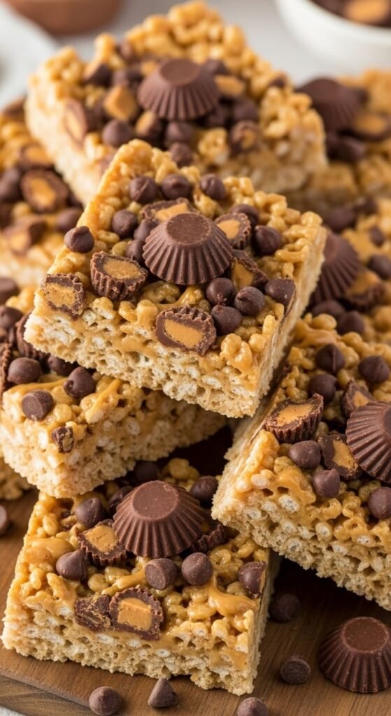 Indulge in a delightful twist on a classic favorite with these Peanut Butter Cup Rice Krispie Treats!
