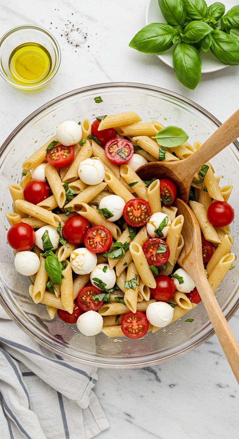 - In a large mixing bowl, combine the cooled pasta, cherry tomatoes, mozzarella, and basil.