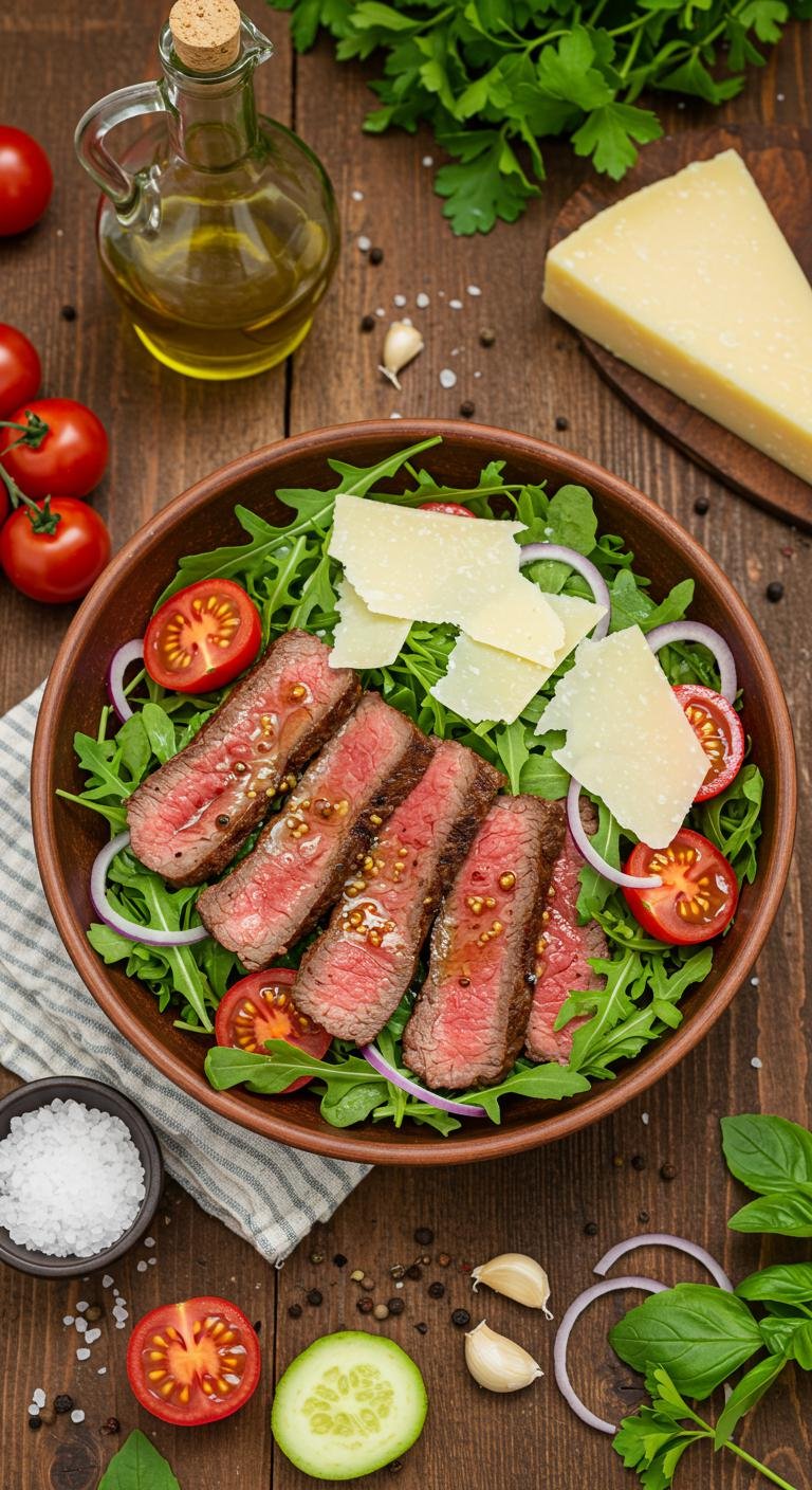Elevate your salad game with this delicious Steak Salad featuring peppery arugula and savory Parmesan shavings!