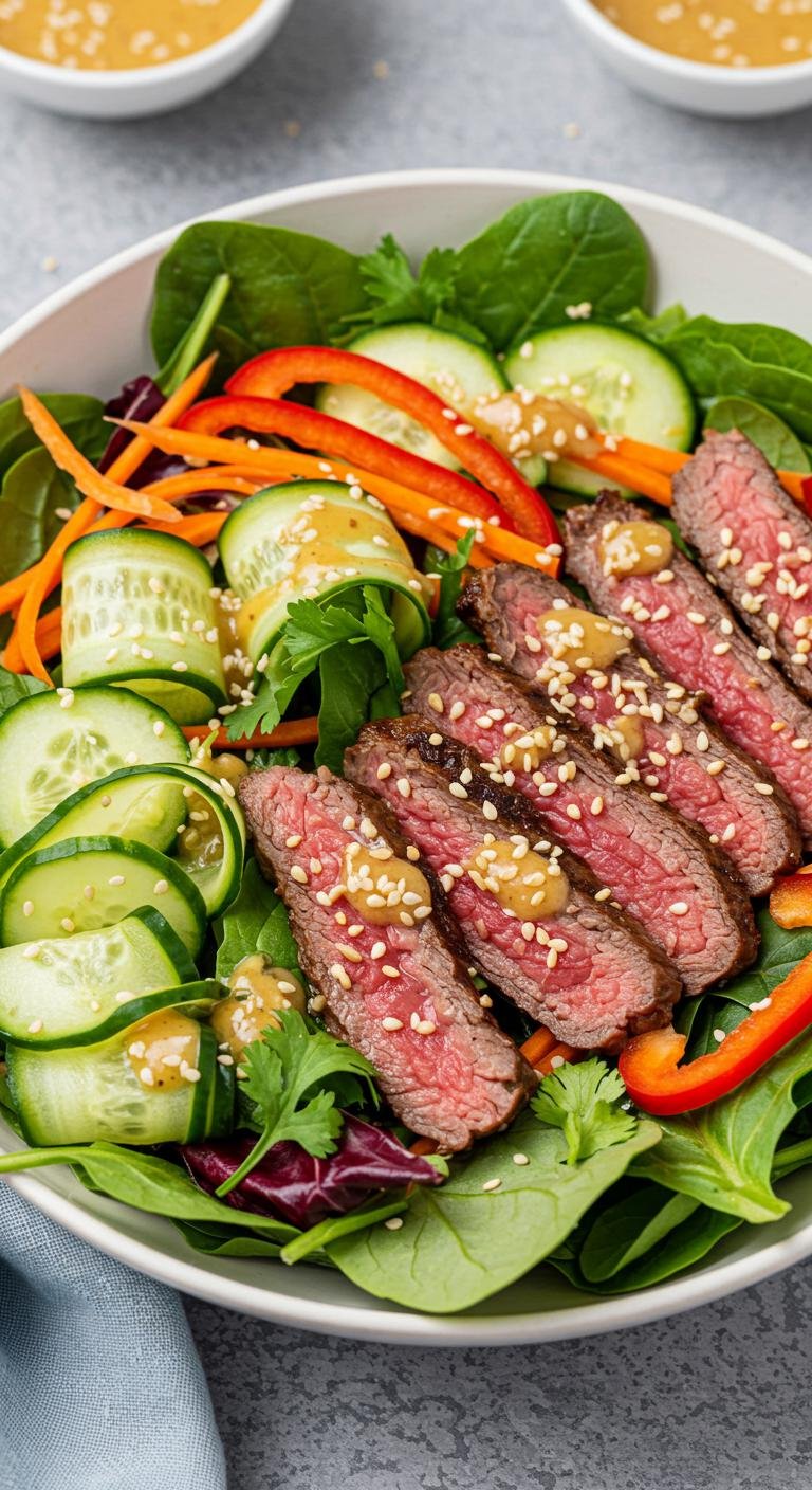 - Add the sliced steak to the salad bowl and drizzle with the peanut dressing.