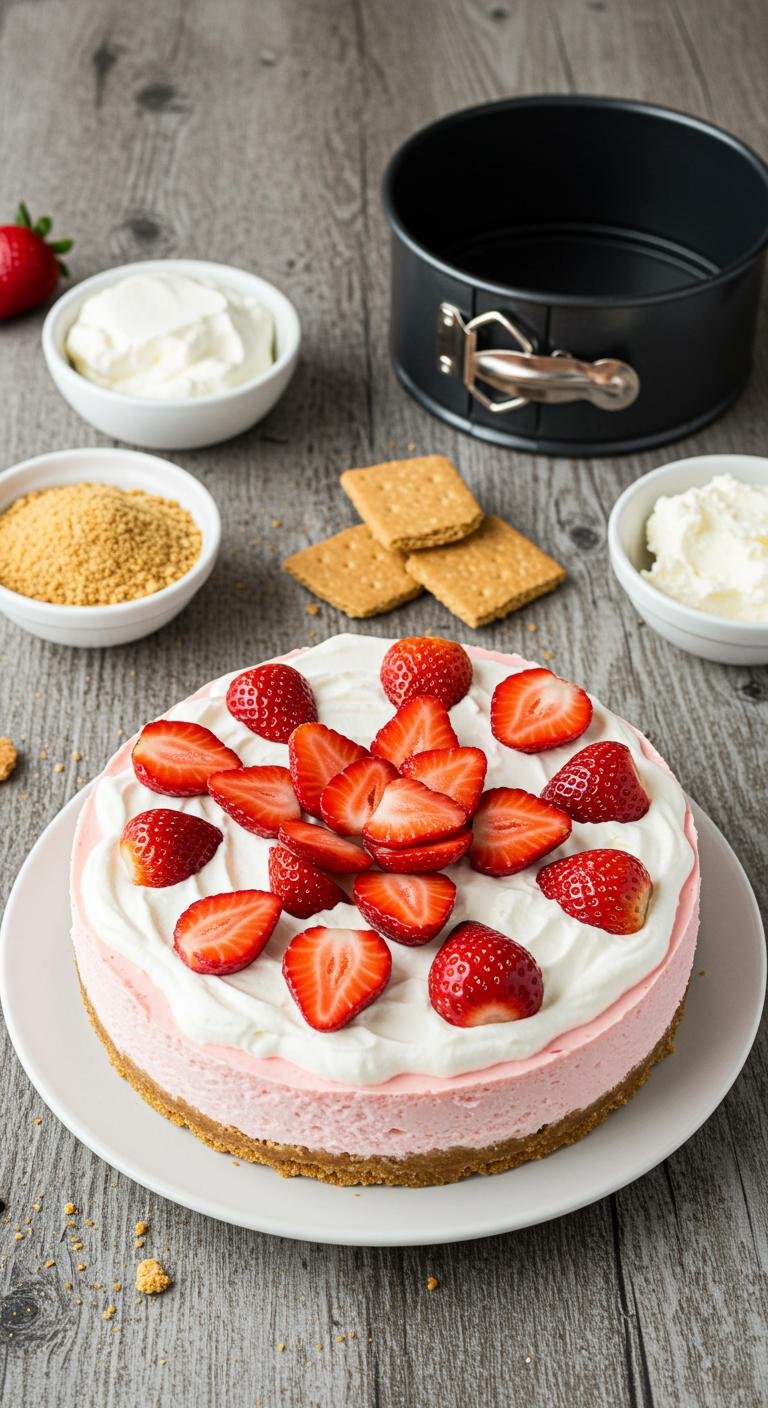 - Serve: Once set, carefully remove the sides of the springform pan. Top with additional strawberries if desired, slice, and enjoy!