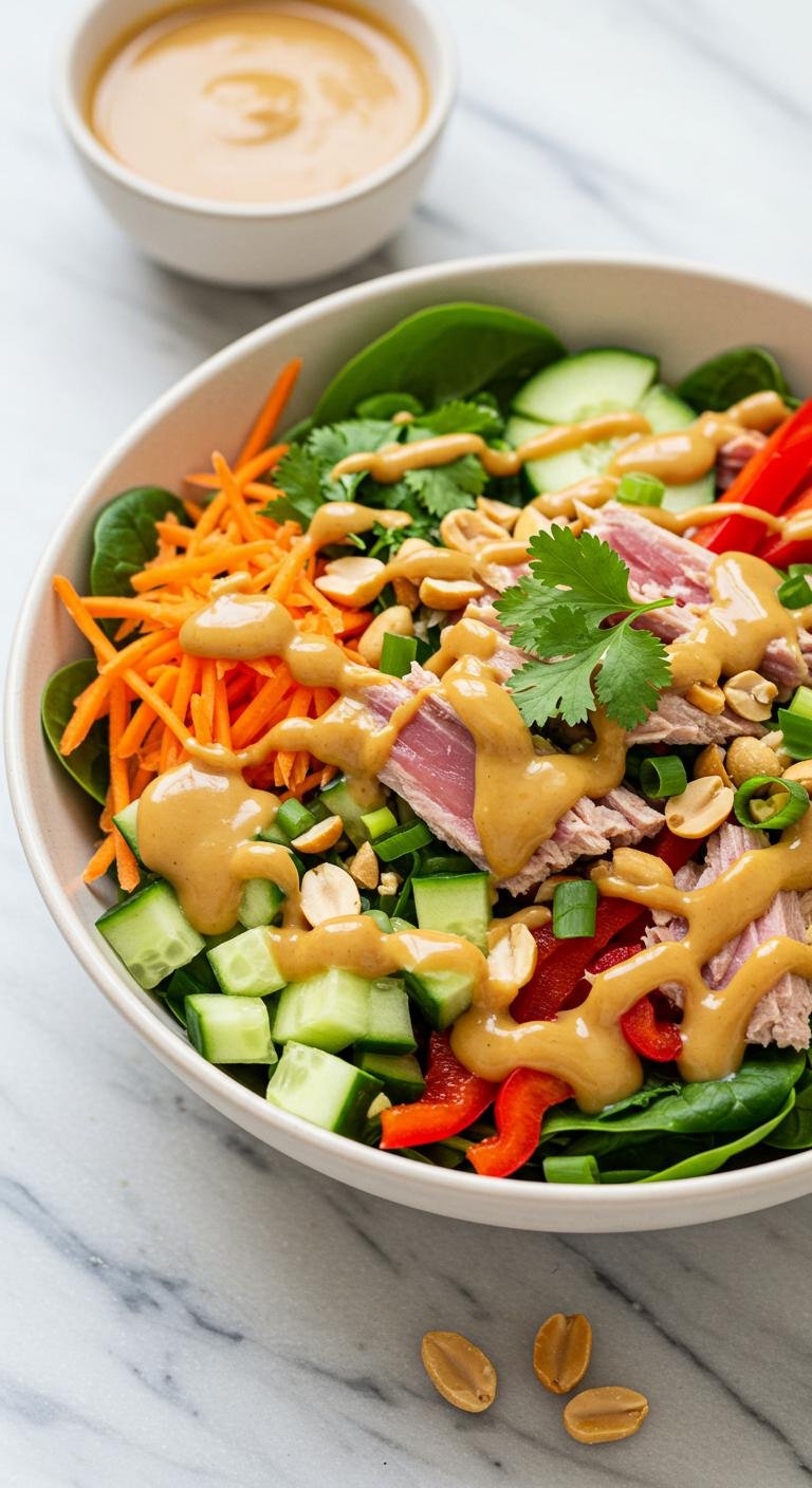 Get ready for a flavor explosion with this Thai Tuna Salad drizzled in a creamy peanut dressing!