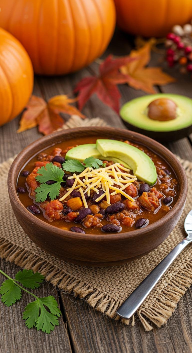 Enjoy this cozy bowl of pumpkin and black bean chili that’s perfect for any chilly day!