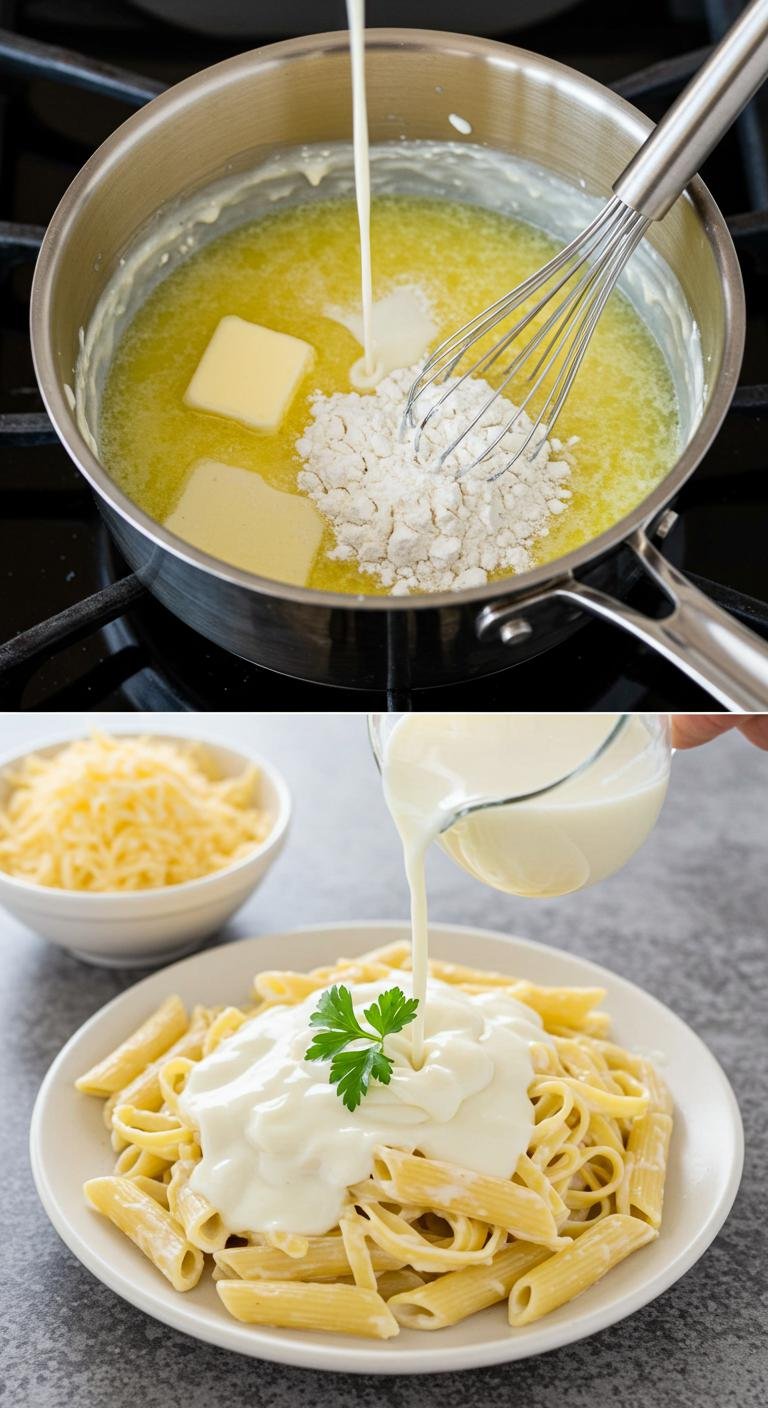 - Gradually pour in the milk and heavy cream, whisking continuously until the sauce thickens, about 3-5 minutes.